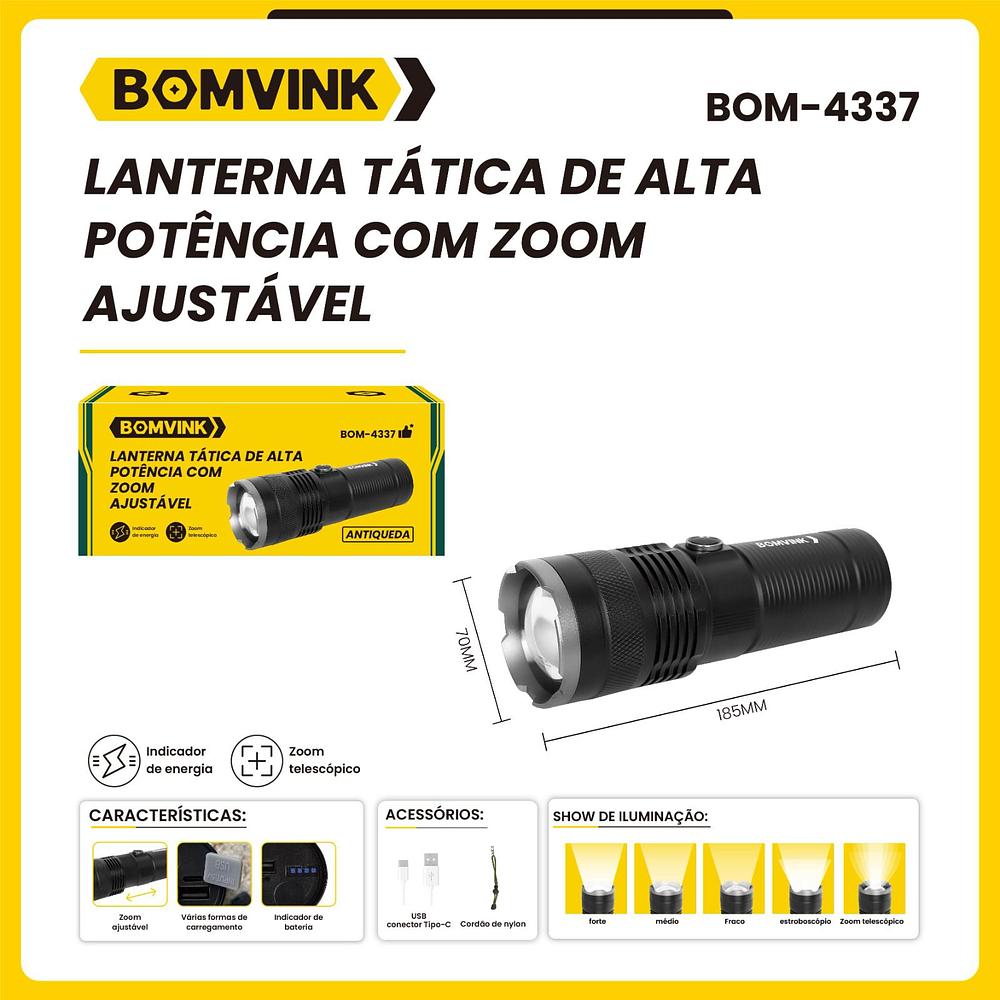BOMVINK - LANTERNA TATICA DE ALTA POTENCIA COM ZOOM AJUSTAVEL