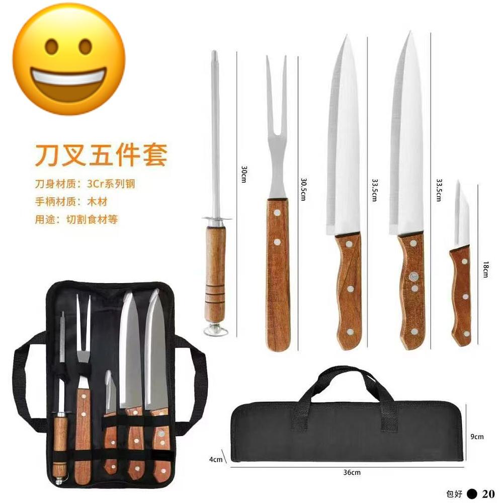 KIT CHURRASCO COM 5 FACAS + BOLSA FACAS COM LAMINA DE AÇO INOXIDAVEL COM CABOS DE MADEIRA